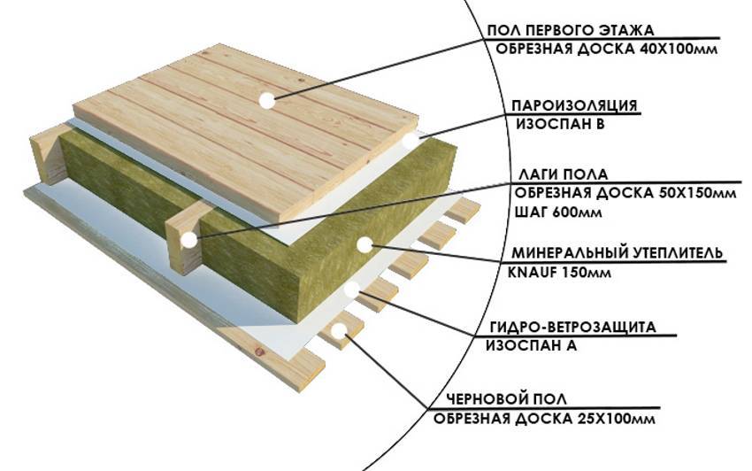 Поверх пирога утепления настилают черновой пол. Если организуют двойной слой утеплителя, то листы минваты монтируют между лаг, уложенных на черновой настил. Затем также укрывают материалы пароизоляционной мембраной. По лагам первого чернового пола настилают доски второго чернового пола каркасного дома.