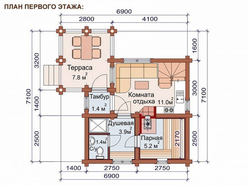 – комнату отдыха (где можно разместить стол и стулья или же диван для времяпрепровождения в кругу друзей после посещения парной)
