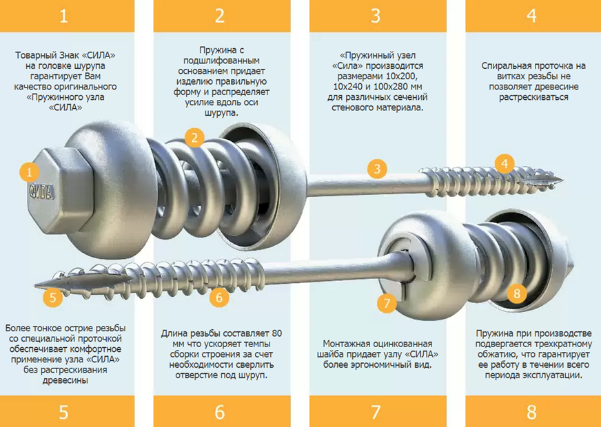 Изделие представляет собой болт с пружиной и резьбой по дереву, изготовленный из высокопрочного антикоррозионного сплава. Крепление бруса таким элементом, как Узел «Сила», обеспечивает прочность и устойчивость соединения, и отсутствие деформации и кручения. Кроме этого, изделие дополнительно нагружает сами венцы, что препятствует образованию трещин и зазоров в процессе усадки. Рекомендуемая установка крепежных узлов на один брус не менее 4 штук.