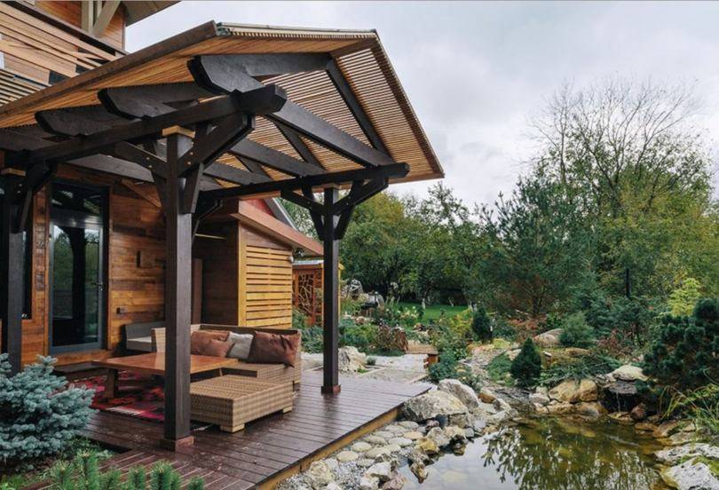 открытая веранда – бюджетный вариант для вечерних посиделок, задействована примыкающая к коттеджу стена;