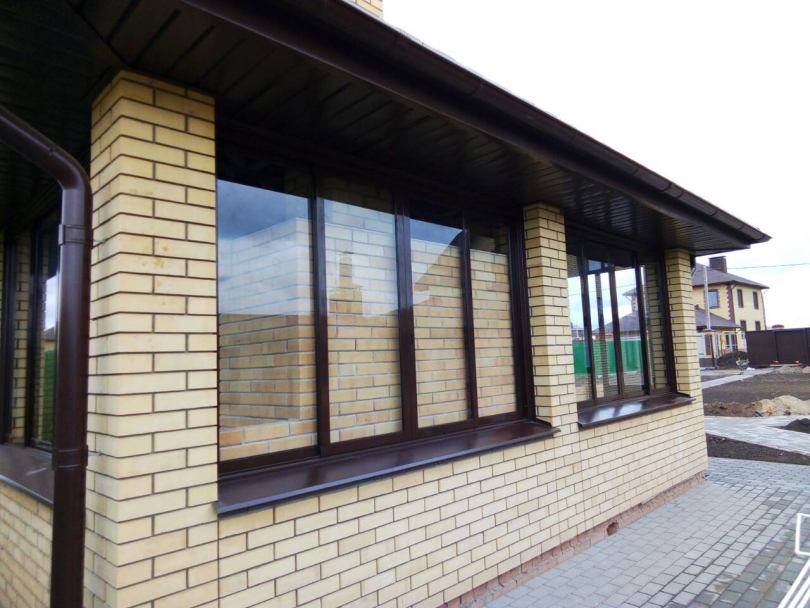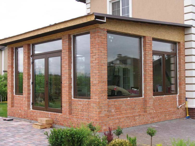 Пристройку к кирпичному дому закладывают на стадии проектирования. Для надёжности и прочности такой террасы важен единый фундамент и, при небольшой площади, общая крыша.