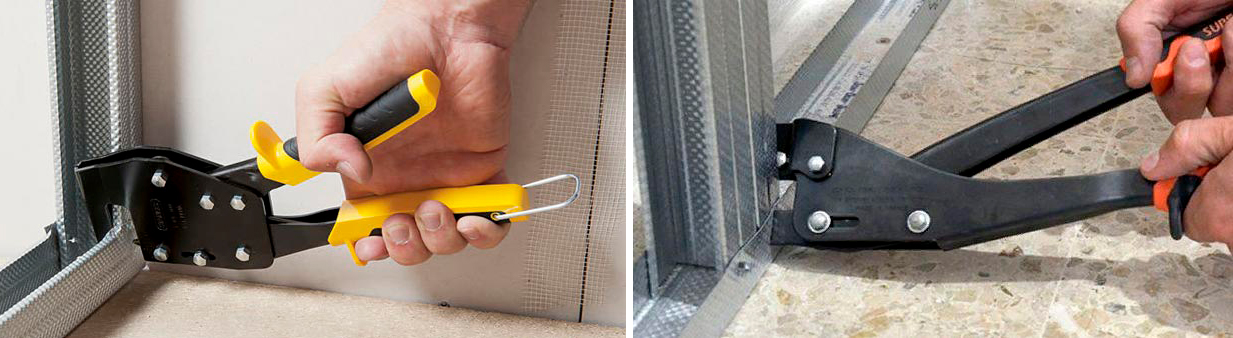 Они нужны для нарезания металлического профиля для гипсокартона. Использование ножниц не создает шума, ими можно работать в помещениях, при отрезании не повреждаются края. Современные модели ножниц по металлу оборудованы пружинами, облегчающими усилие, а также эргономичными ручками.