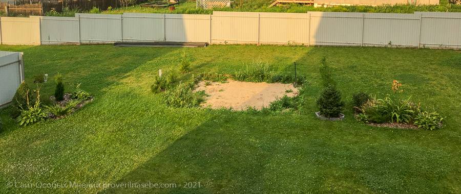 На следующее лето я понял, что моя мечта о песчаном пляжике у бассейна была не очень удачной идеей. Сквозь песок начали активно лезть сорняки (откуда только брались – вокруг газон). Пришлось бы постоянно бороться с ними. Да и сам песок начал довольно активно растаскиваться ногами и раздуваться ветром по всему участку.