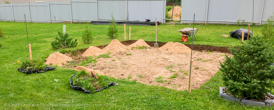 Значит, надо рыть котлован. Я решил не мелочиться, заказал яму размером пять на пять метров и глубиной тридцать сантиметров. К слову, в моем случае ее выкопали и засыпали песком ещё в прошлом году, но площадку залить не успели. Зима пришла быстрее, чем ожидалось.