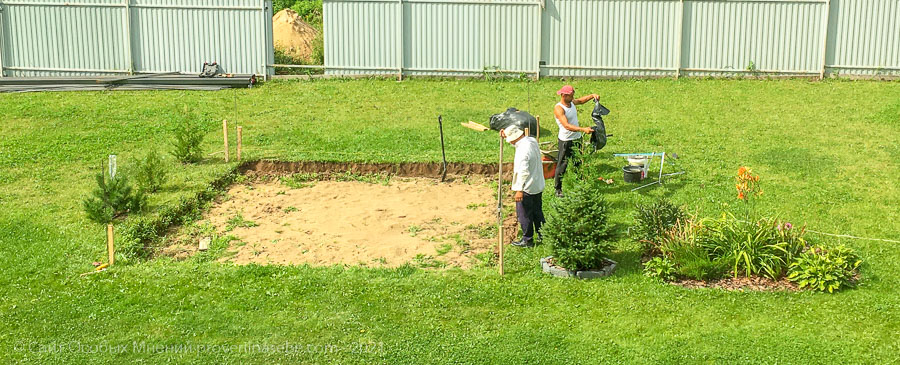 На дне котлована соорудили песчаную подушку толщиной в 15 сантиметров. И ещё на 15 сантиметров конструкция должна была возвышаться над поверхностью земли. Это избавит от наносов грязи с газона, когда весенние ручьи захотят пронести талые воды именно в этом месте.