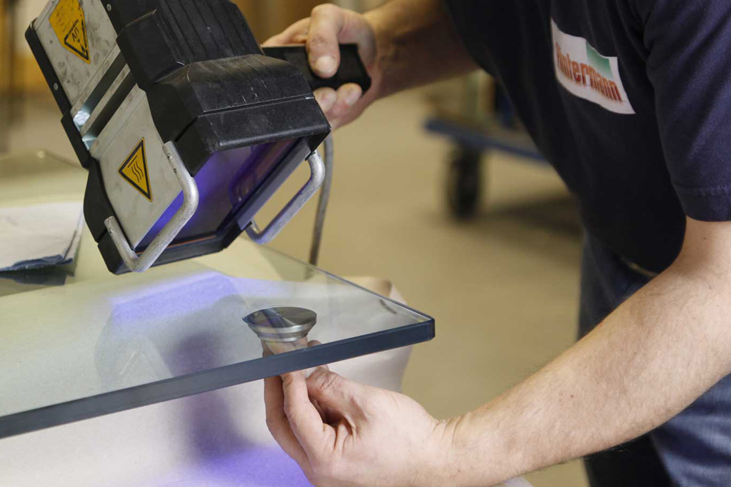 Для того чтобы добиться прочного соединения можно использовать технологию склеивания с применением ультра-фиолетовой лампы. Здесь следует использовать клей для стекла и металла VERIFIX MV 750 или В 682-0. Первый пригоден лишь для прозрачных стёкол.