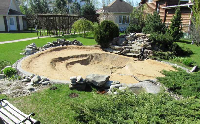 Подготовленный для водоема котлован зачищают от веток, грудок земли и прочего мусора. Дно и стенки ямы утрамбовывают. Если на даче слишком сыпучие почвы, их укрепляют. Для готовой формы важна идеально ровная поверхность котлована. Плоскость выравнивают при помощи строительного уровня.
