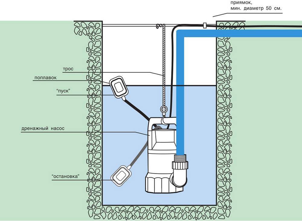 Погружной дренажник снабжается специальным пластиковым пузырем или поплавком, который сигнализирует о достижении определенного контролируемого уровня жидкости, вследствие чего прибор автоматически включается.