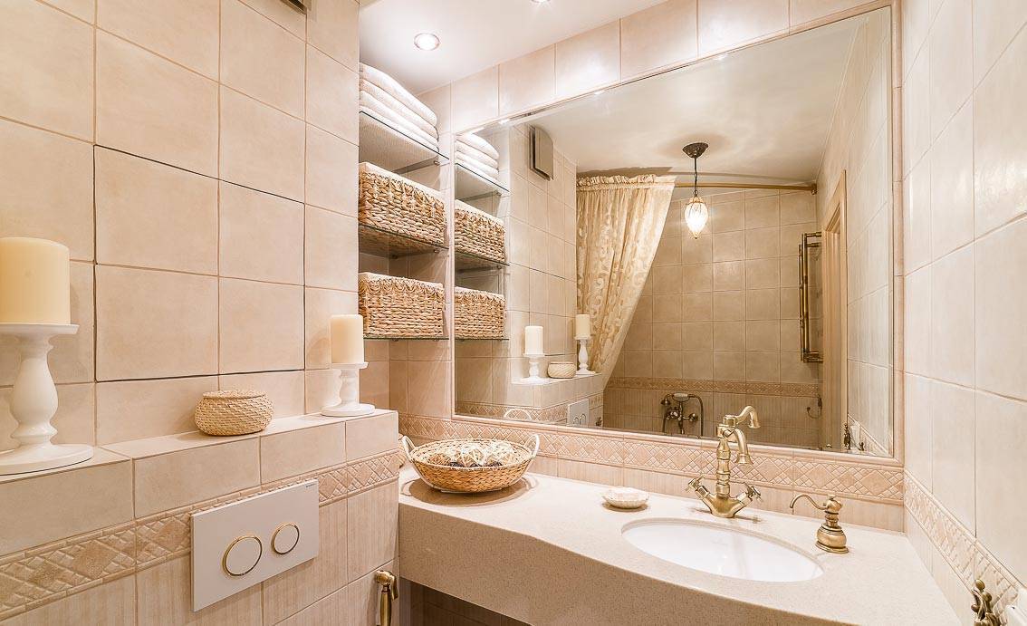 Для увеличения пространства напольные плиты монтируются по диагонали, стеновые панели оформляются горизонтальной укладкой блоков и фризами. Горизонтальная полоса располагается в 80-90 см от пола.