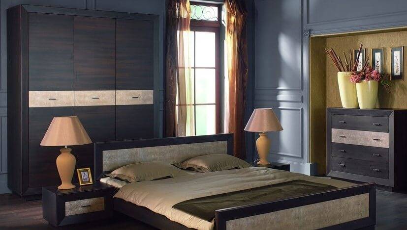 Учитывая, что спальные комнаты обычно имеют скромные габариты и предназначены для отдыха, чаще всего здесь устанавливают компактный шкаф. Главная роль в мебельной композиции отводится постели.