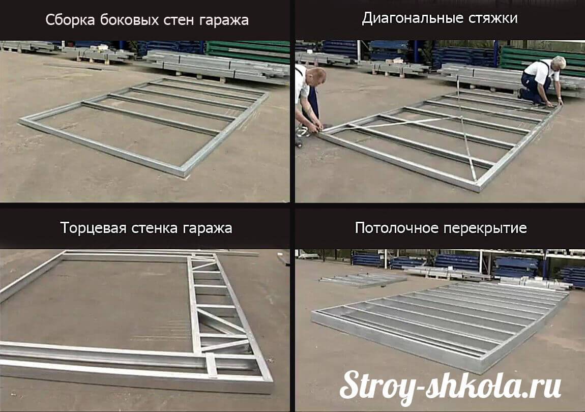 К выполнению каркаса гаража можно приступать сразу после того, как будет подготовлен фундамент или ровная площадка под его установку. Если вы покупаете сборный комплект, он обязательно будет снабжен подробной инструкцией по последовательности сборки гаража. В целом технология сборки включает такие этапы: