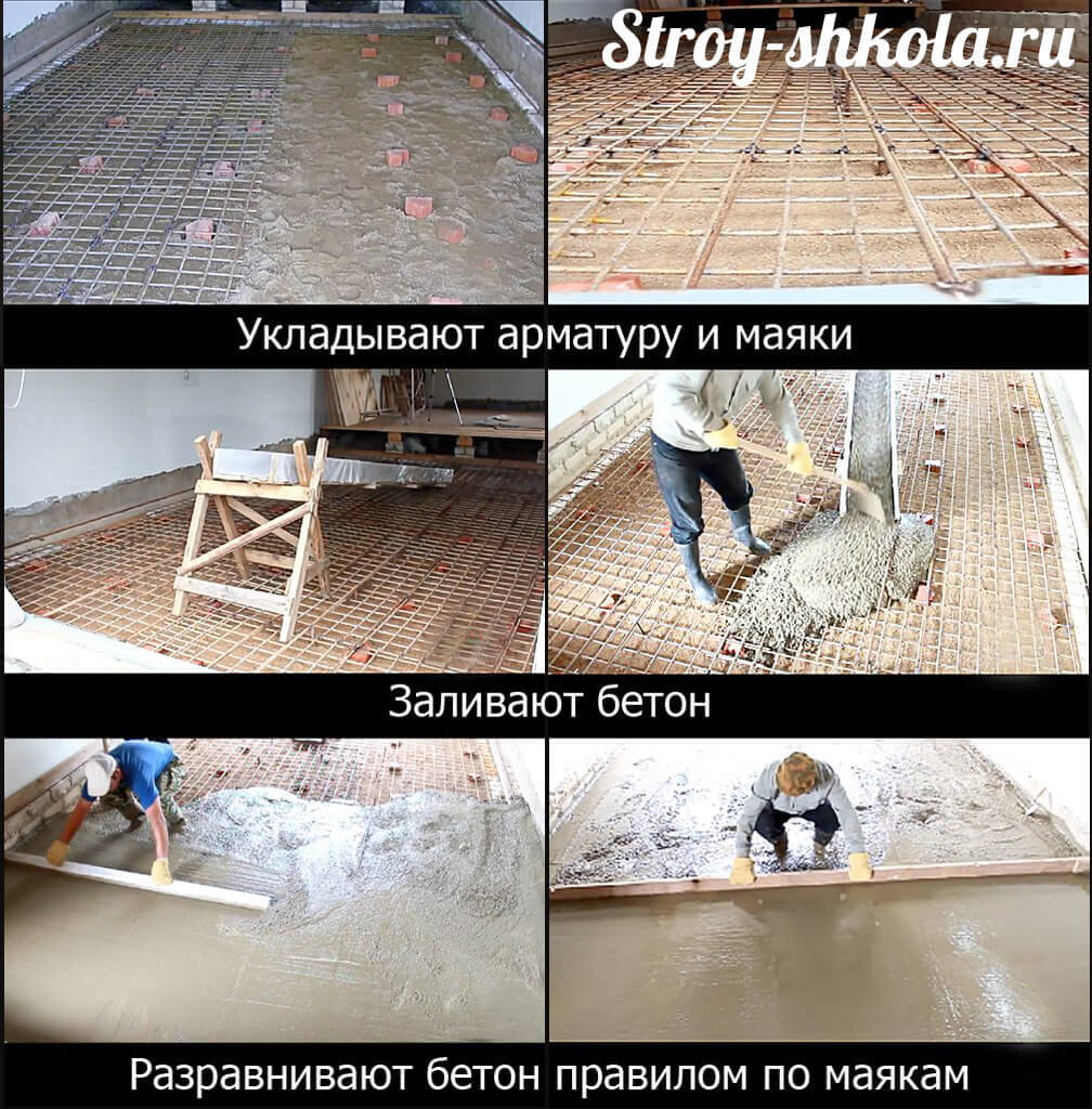 - Замешивают бетон с пониженным содержанием щебня: 1:3:1, выливают его на подготовленную поверхность и распределяют по поверхности будущего пола, после чего разравнивают правилом по заранее установленным маякам.