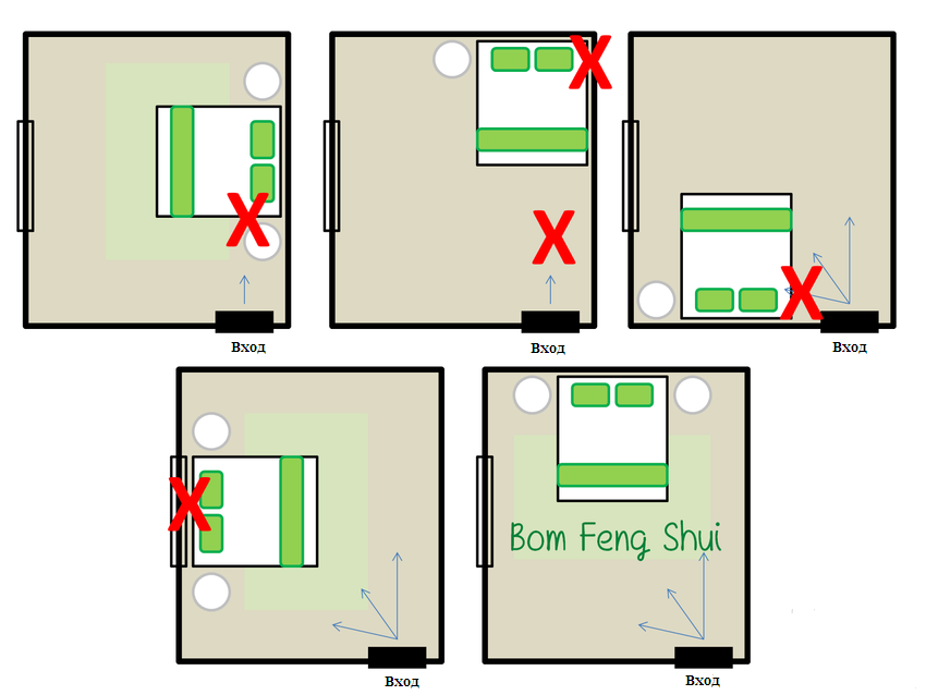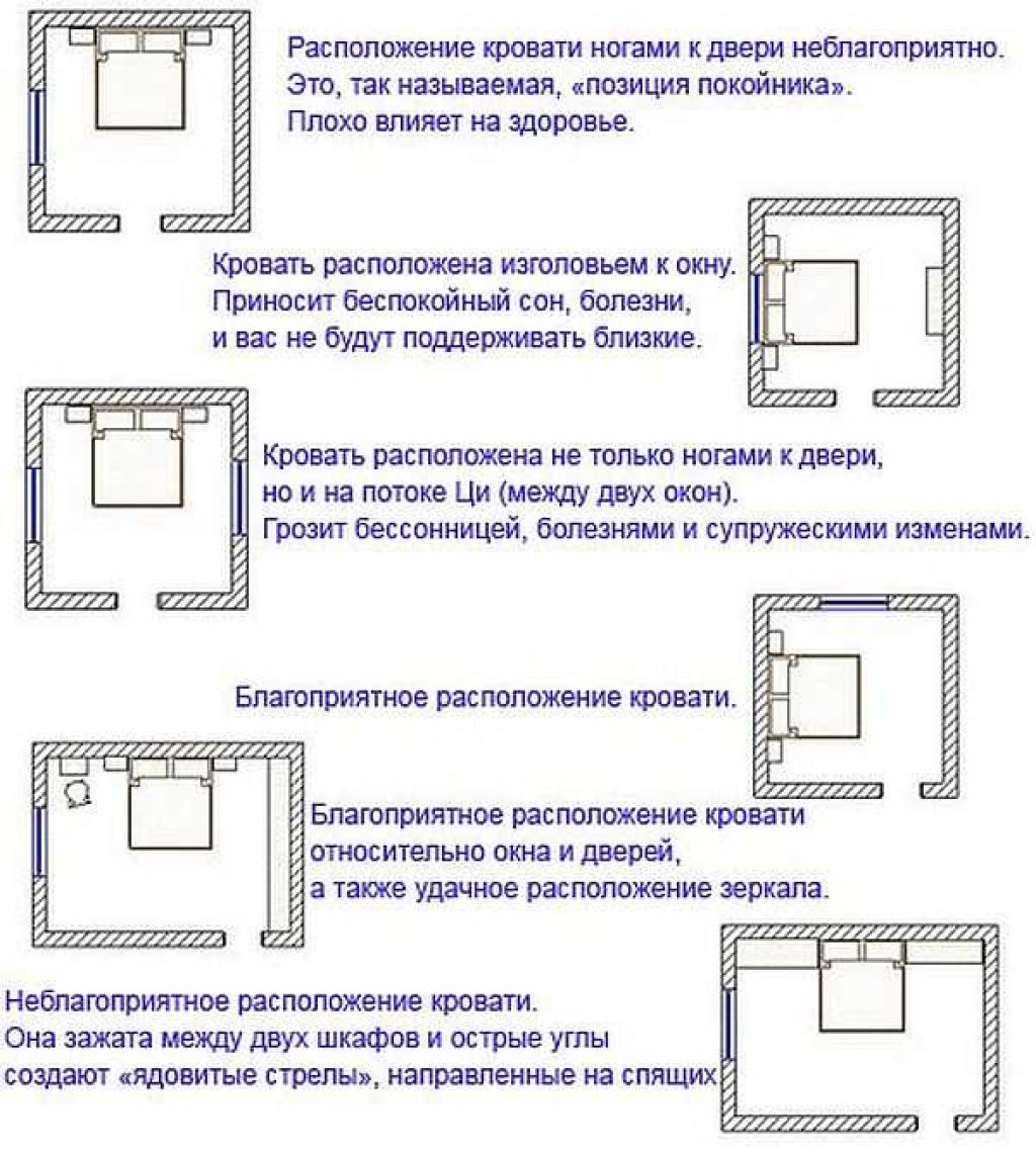 Недопустимо ставить кровать напротив двери, особенно таким образом, чтобы ноги спящего были направлены в проем. В фэн-шуй эту позу называют позой смерти. Кстати, у христиан принято выносить усопшего из дома ногами вперед. При невозможности изменить положение кровати на линии необходимо установить спальное место; дверь необходимо установить с перегородкой или ширмой.