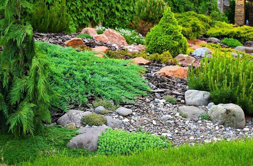 Карликовые хвойные кустарники разнообразят флору альпийской горки