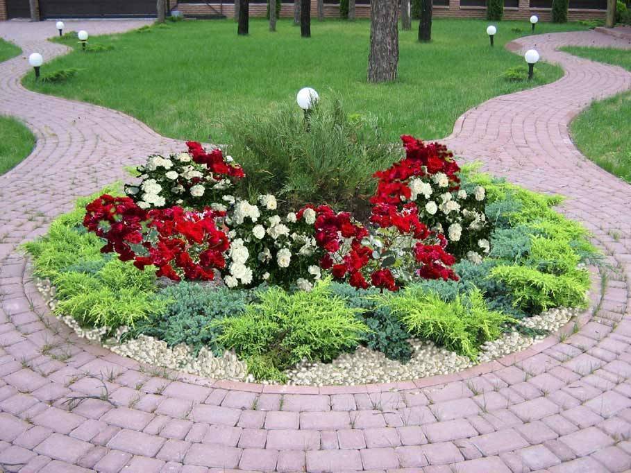 В данной композиции можжевельник подчеркнет розы и выделит их на фоне всей клумбы. Шалфей помогает выгодно смотреться светлым сортам розы. В случае если шалфей разрастется его, возможно, формировать любой формы. Хоста, высаженная по краю клумбы, дополняет созданную композицию.