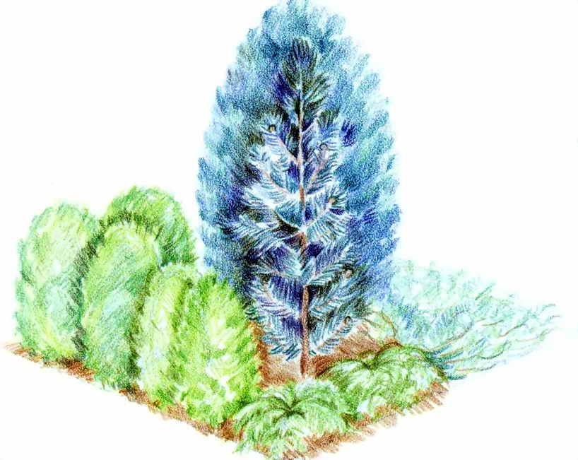 Для того чтобы высадить хвойную клумбу в ландшафтном дизайне, используют данную композицию: