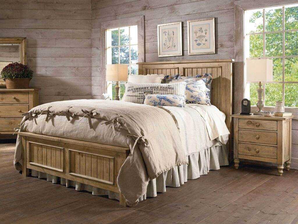 При выборе мебели для спальни в стиле кантри предпочтение всегда отдаётся предметам из натурального дерева. В приоритете простые формы и некоторая массивность, гарантирующая надёжность и долговечность.