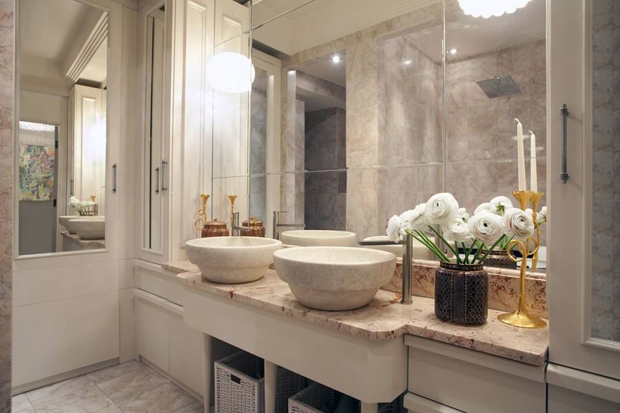 Не стоит выбирать вычурную сантехнику, лучше остановиться на классических вариантах. Под раковиной устанавливается тумбочка. Обязательный элемент меблировки – навесной шкафчик, на дверцах которого располагается зеркало (отлично подойдут зеркала в форме овала или прямоугольника).