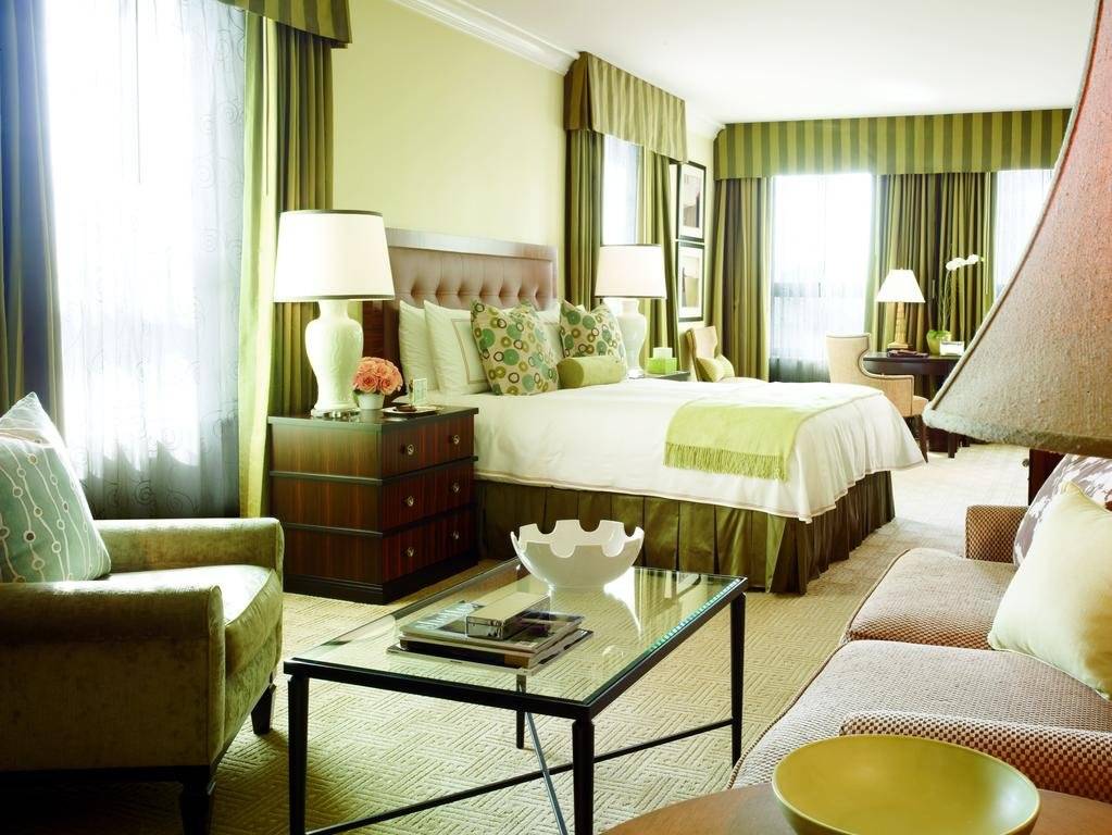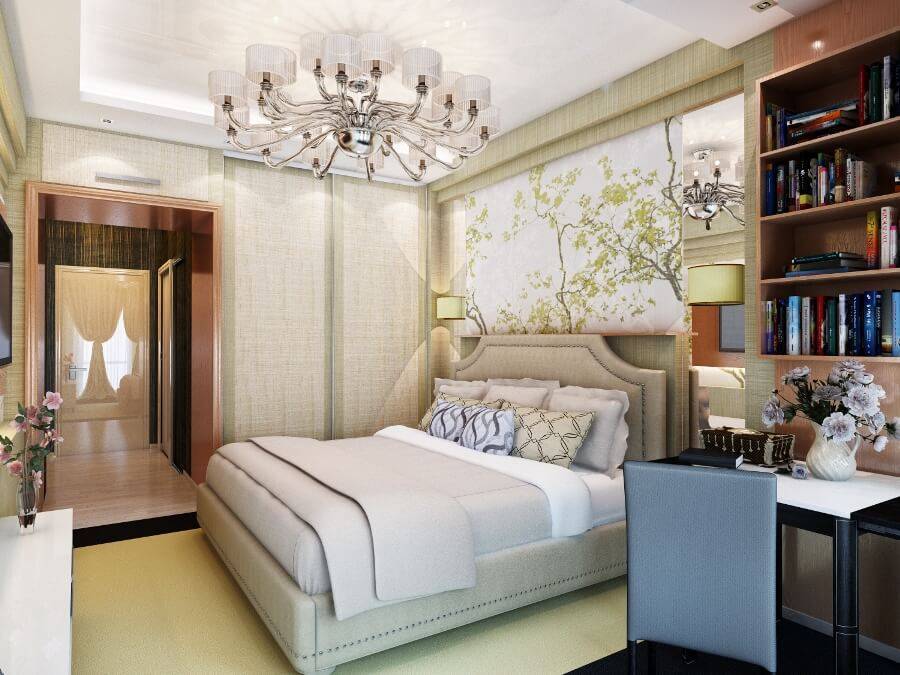 Гораздо проще обустроить комнату в 18 кв. м., которая позволяет вместить в себе все необходимые элементы декора. Кровать занимает почетное место, а затем подбираются другие важные предметы интерьера. С двух сторон у кровати нужно расположить маленькие тумбочки, а у подножия поставить строгую банкетку. Тут же идеально впишется туалетный столик с большим зеркалом, а напротив окна хорошо расположится шкаф. Люстра должна находиться в центре комнаты. Для добавления света на тумбочках можно установить лампы.