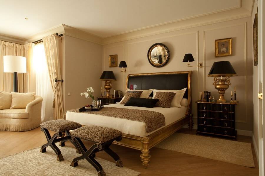 Мебель и элементы декора должны приковывать к себе взгляд, поэтому кровать должна выглядеть массивно и надёжно, а ее спинка должна иметь узорчатую форму. Эффектно будут смотреться красивые прикроватные тумбочки на ножках, а дополнить интерьер поможет небольшая банкетка. На окнах должны быть однотонные шторы, которые могут иметь голубой, розовый или коричневый цвет. На стенах обязательно должны быть состаренные картины и настенные светильники.