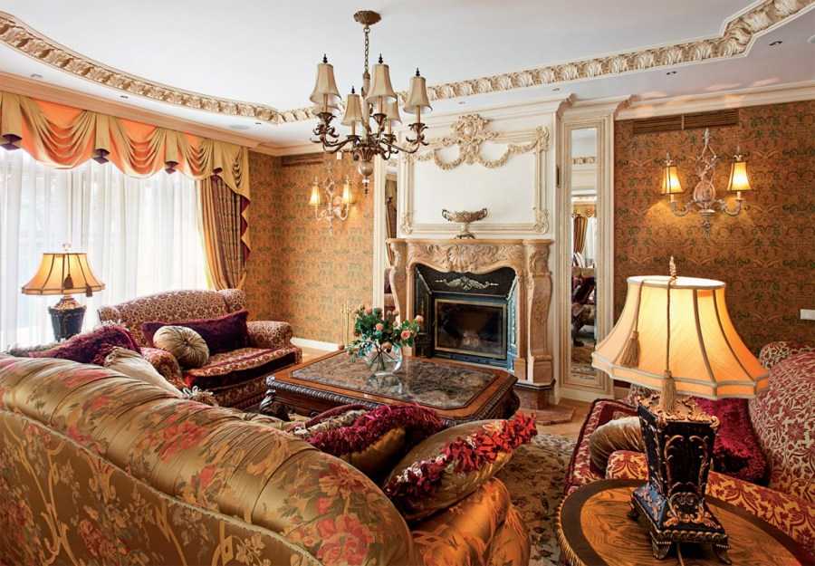 Дизайн интерьера внутри дома обязательно должен соответствовать той эпохе, в приемах которой было оформлено все здание. Особого внимания заслуживает гостиная, так как именно она является главной частью всего дома. Располагать ее необходимо в центре здания, под гостевое пространство отводится большое помещение, зачастую совмещенное со столовой и кухне.