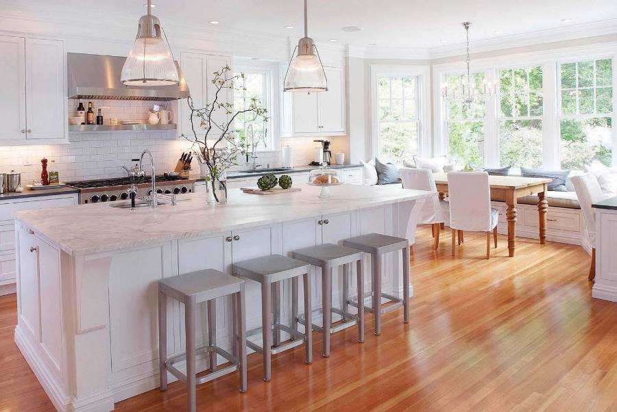 - Отделяют зону кухни и гостиной обеденным островом и барной стойкой.