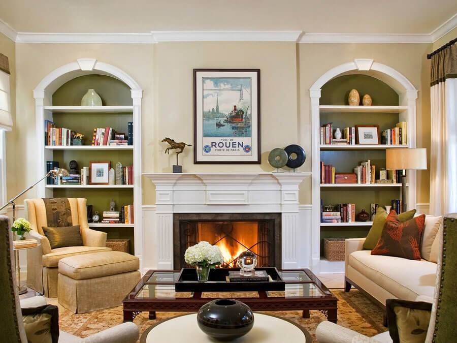 Это могут быть какие-либо элементы декора, рамки с фото, семейный альбом. Центральным местом гостиной становится диван: он должен быть повернут к камину, стоять строго в середине комнаты, а перед ним обязательно располагается небольшой столик для чая и десертов.