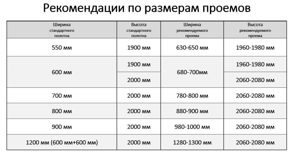 Таблица типовых размеров дверных проемов