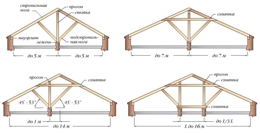 Выбирается тот или иной тип стропильной системы не спонтанно, а в зависимости от конструкции строящегося дома и его размеров. Далее о каждом виде стропильных систем.