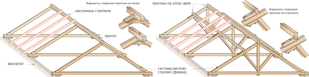- В первом варианте, фермы поддерживают прогоны, которые лежат на них сверху. Наслонные стропила опираются на прогоны и получаются выше ферм. Стропила висячих и наслонных стропил находятся в разных плоскостях.
