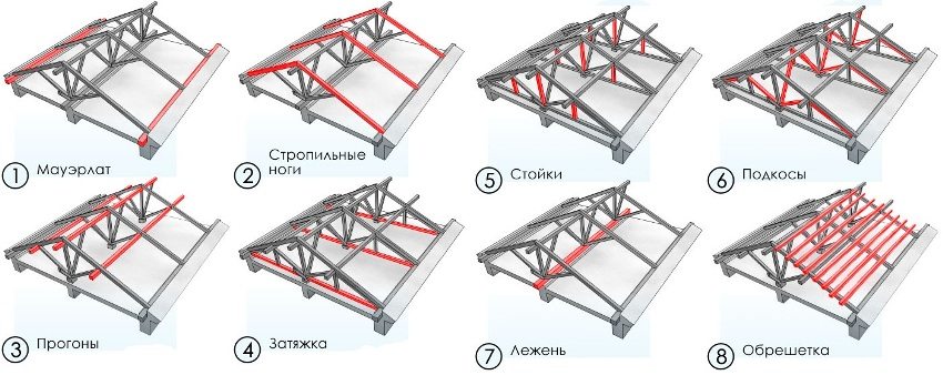 Часть стропил, которые соединяют один конец стоек, функционирует как ригель для скатов, расположенных сбоку, причём для верхней части конструкции они являются затяжкой.