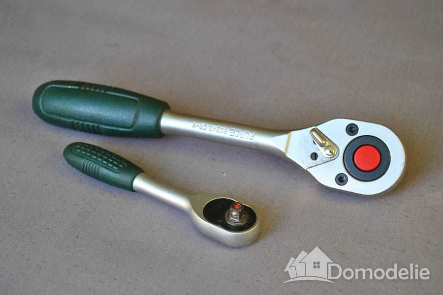 - Рукоять с храповиком. Работает по типу прерывистого движения в одну сторону с преобразованием возвратно-вращательного движения и переключателем, позволяющим менять направление движения. Обычно такие отвёртки выпускают с комплектом различных насадок, позволяющих применять инструмент практически ко всем видам крепежа.