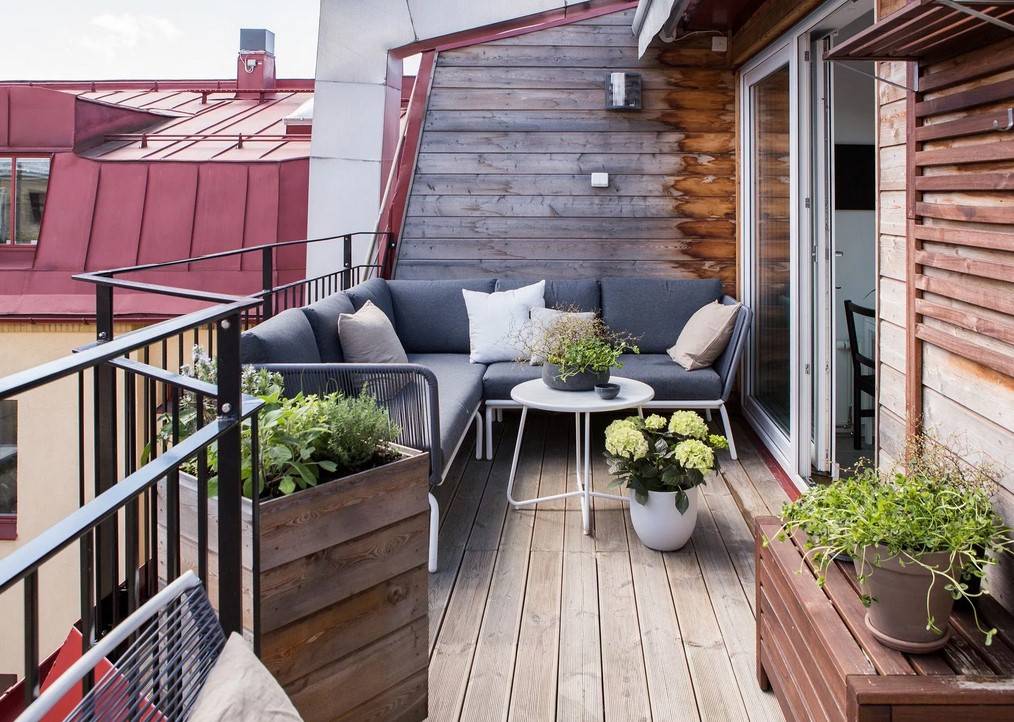 Террасу на балконе оборудуют с крышей или без нее. Для защиты от солнца или осадков можно оборудовать над сооружением навес или тент.