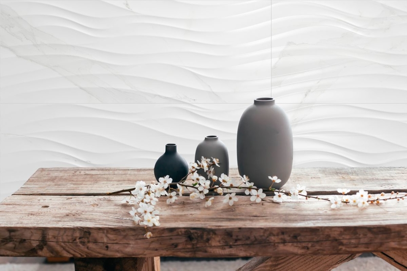 1. Одноцветная рельефная плитка. Этот вид объемной плитки – настоящая находка для ценителей минимализма. Несмотря на монохромную цветовую гамму, «стилистический нейтралитет» не смотрится скучно. Данный тип облицовочного материала подходит для ванной комнаты. Кроме того, он уместен в дизайне кухни и любой комнаты в современной стилистике.