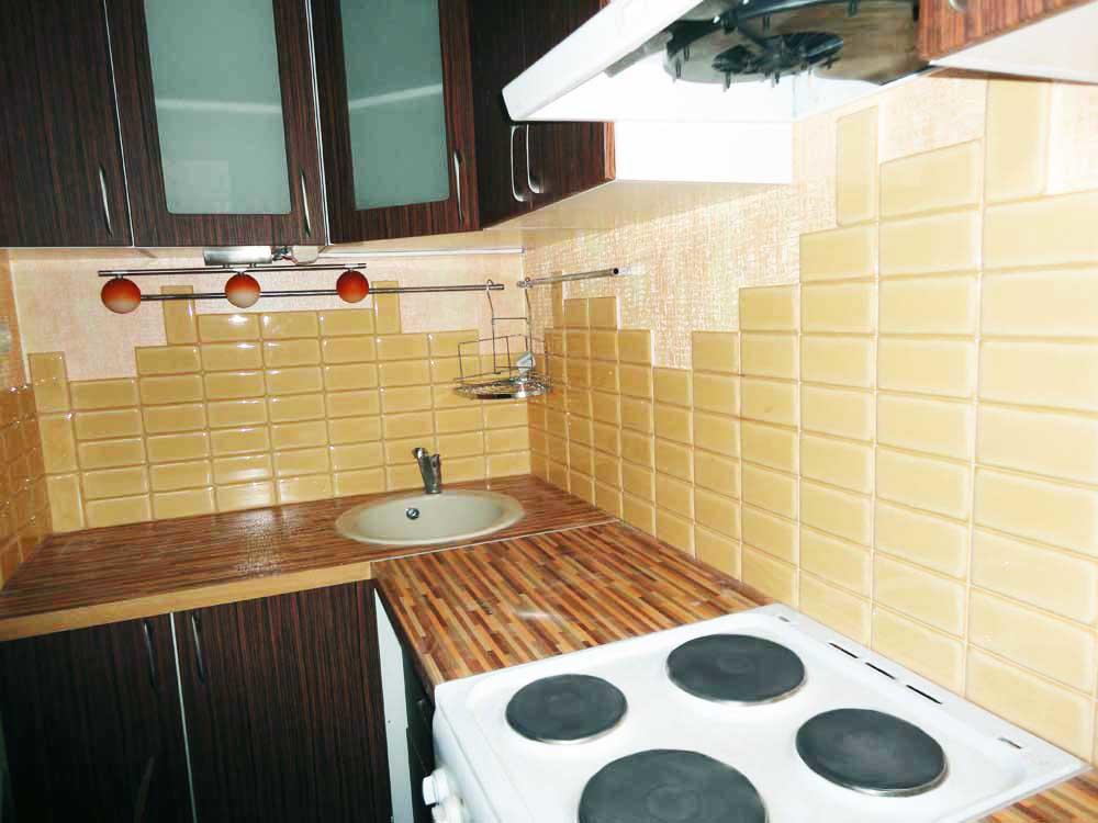 Стены придется разграничить по зонам. Рабочая поверхность будет выложена керамической плиткой (самое недорогое покрытие из легко моющихся и не боящихся высоких температур), а все остальное — отделано моющимися обоями, шпаклевкой или краской.