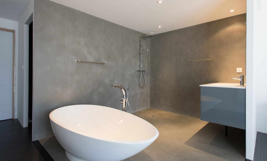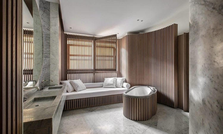 Дизайн совмещенного санузла с ванной, сочетание декоративной штукатурки и дерева в интерьере