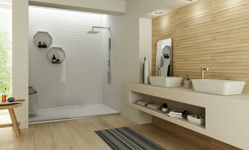 Но нужно учитывать в небольшом пространстве дерево выглядит акцентно. Поэтому точно не стоит выкладывать такой пликой больше 50% поверхностей. Иначе рискуете получить сходство с деревенской баней. Возьмите на заметку: эффект “перетекания” материала с экрана ванны на пол выглядит очень круто!