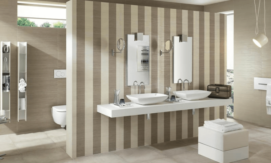 В случае, когда в санузле потолки небольшой высоты, лучшим решением будет использование вертикальных линий.