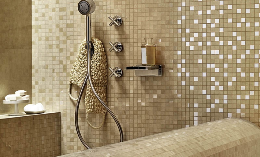 Эффектно смотрится декорирование мозаикой, когда она будто «наплывает» на плитку, создавая зрительный объем – эффект водопада, водного потока.