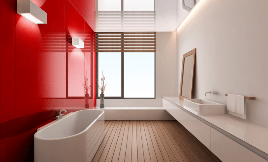 Вариант № 1. Контрасты – основа современного интерьера: сочетание красного и черного, белого и черного, ярких тонов с нейтральными стало базой в дизайне ванной комнаты в стиле минимализм, хай-тек, арт-деко. Контрастное сочетание выполняет декоративную функцию.