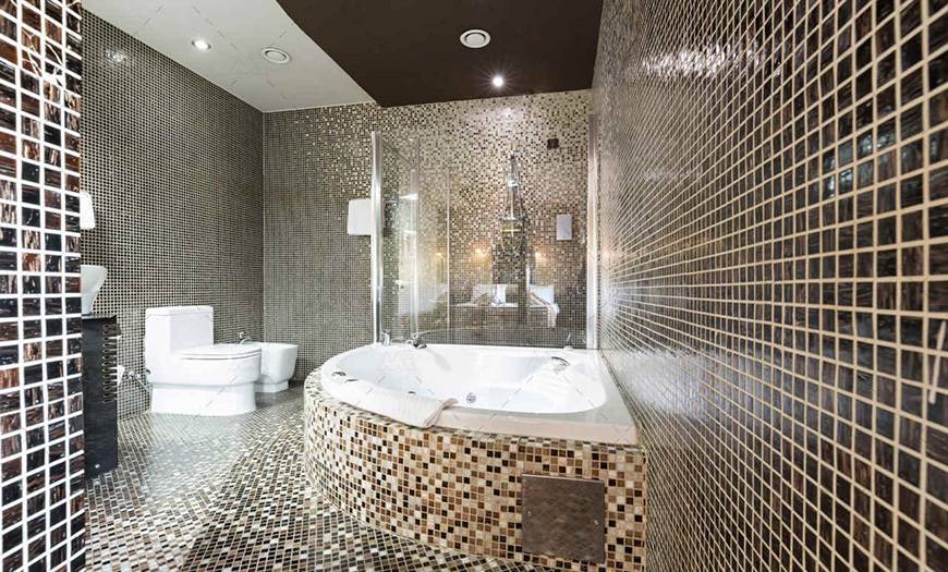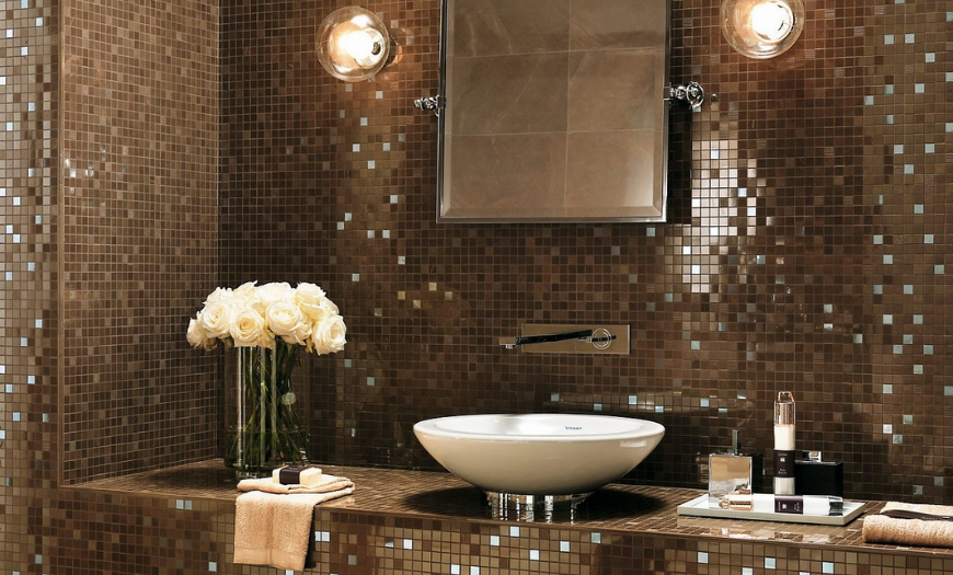 Современное модное оформление, особенно популярное для ванных комнат. Мозаикой можно выложить всю поверхность, что будет стоить очень и очень недешево, зато выглядеть — эффектно. Мозаика способна преобразить как просторное помещение, так и маленькое.