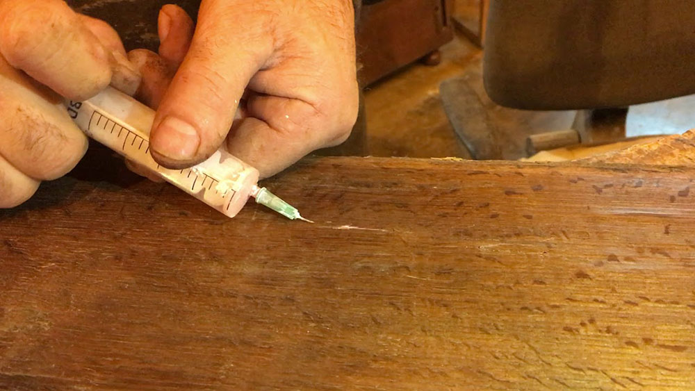 Приклеить шпон. Если утюг не помогает справиться с проблемой, то лист шпона можно приклеить к основе. Для этого понадобятся клей ПВА и шприц