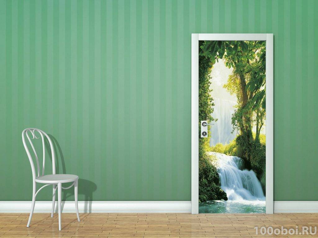 Очень популярно сегодня оформлять двери при помощи фотообоев. Они даже продаются подходящей ширины. Есть абстрактные изображения, с морскими, цветочными, урбанистическими и другими мотивами, поэтому выбрать что-то можно обязательно. Как правило, такие обои выпускаются на виниловой основе с клеящей поверхностью. Поэтому декорирование не составит труда.