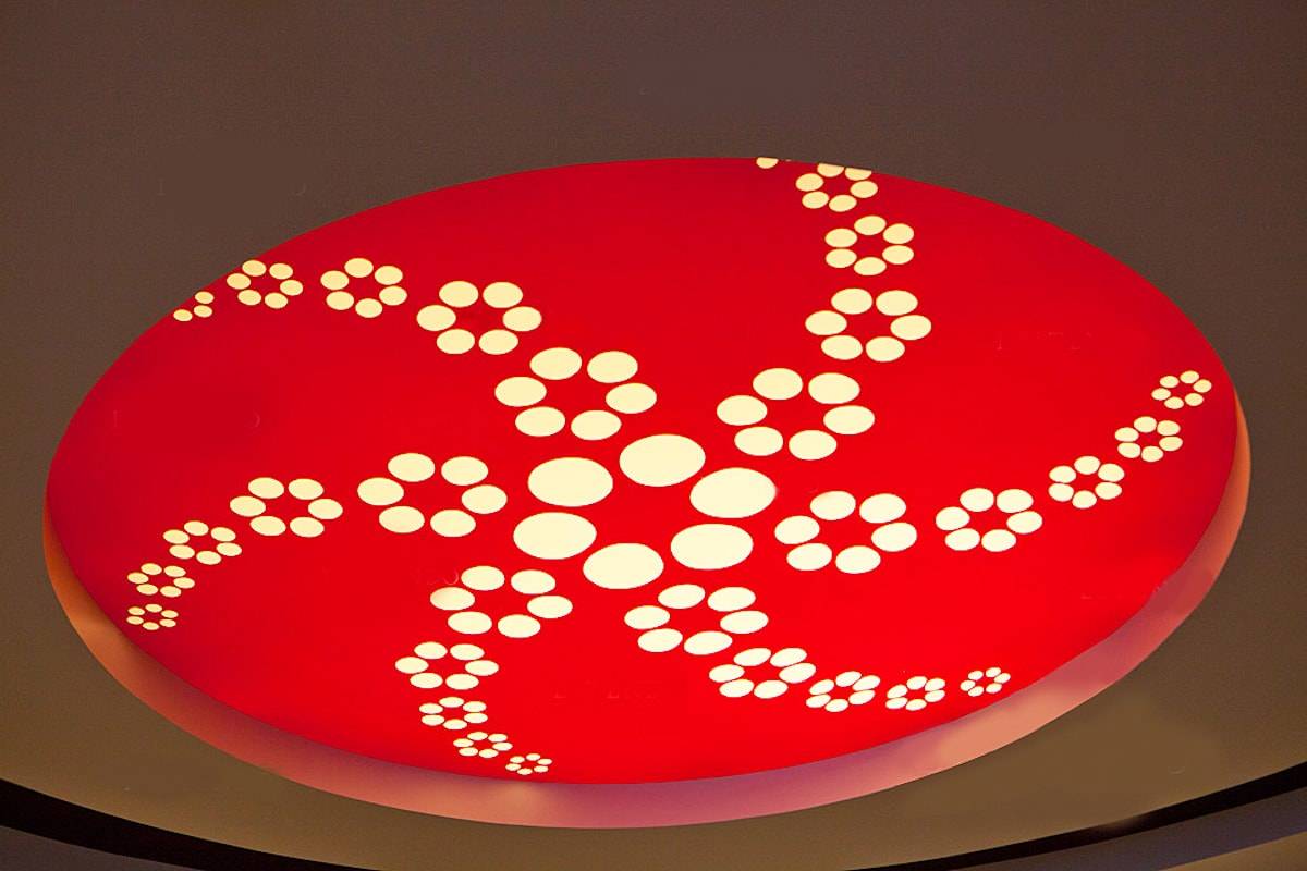 Применить подобный потолок можно в различных интерьерах. Сложные узоры и орнаменты на полотне привлекательно будут смотреться в помещении, которое оформлено в восточном стиле. Стилистическое направление хай-тек будет подчеркнуто с помощью крупных круглых отверстий на потолке. Симметричные изображения наиболее привлекательно будут смотреться в том случае, если в центре потолка будет находиться люстра. Для создания подсветки основного фона можно использовать популярные на сегодня светодиодные ленты и точечные светильники.
