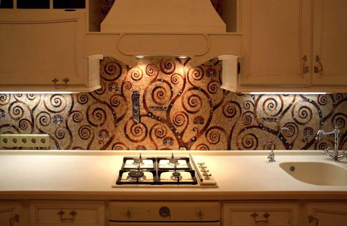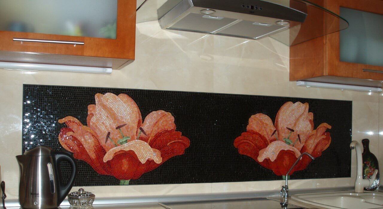 Каменная мозаика – это элитный вариант декора. Мозаика выпиливается из камней и минералов. Недостаток такой отделки – высокая стоимость. Также восприимчива к пятнам на поверхности – пятна от свёклы или кофе могут оставить несмываемый след. Для того, чтобы пятна не оставались на поверхности – камень покрывают сверху акриловым лаком.