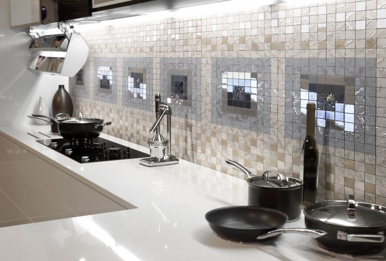 Стеклянная мозаика – небольшие плитки, сделанные из стекла. Все стеклянные плитки приклеены к основанию, что облегчает работу по декорированию. Стекло расширяет пространство кухни и придаёт фрагменту стены или фартуку праздничный вид. Стеклянная мозаика на стену производится из белого кварца, для блеска и цвета сюда добавлены перламутр и пигменты. Главное преимущество – устойчивость декоративной стеклянной мозаики к огню.