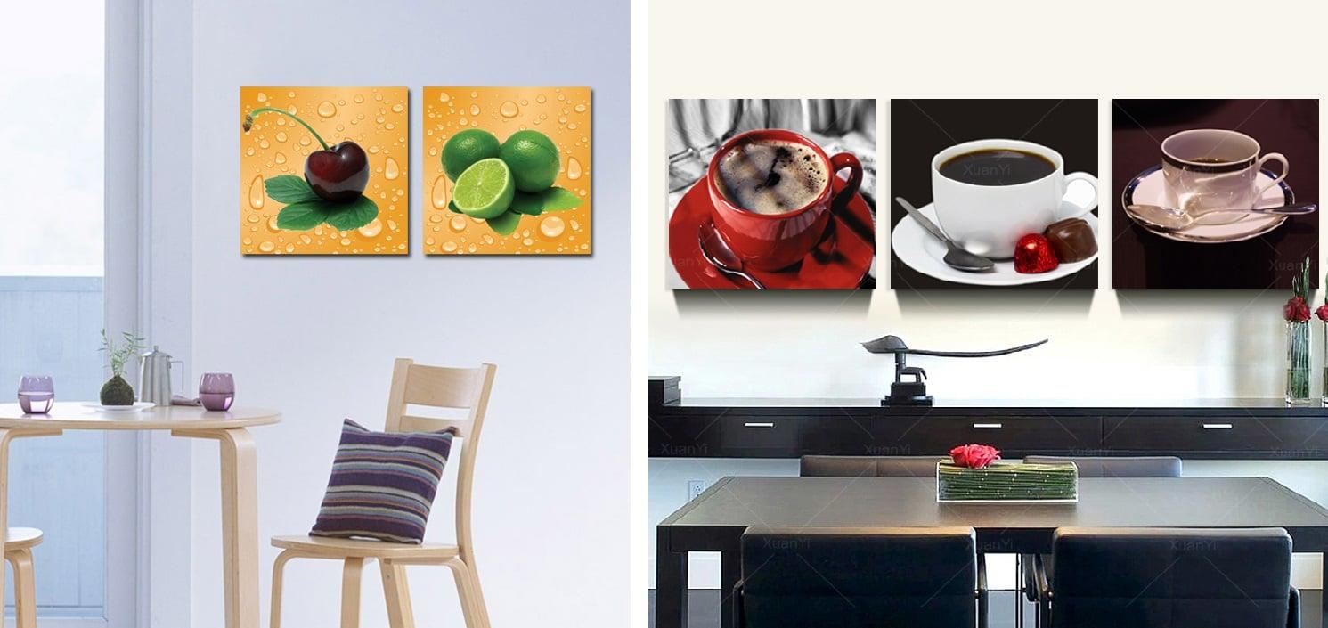 Панно с гастрономическими сюжетами, вышивкой, пейзажем, натюрмортом или просто абстрактная композиция, украсят и эффектно выделят обеденную зону из общего пространства и еще больше подчеркнут ее назначение.