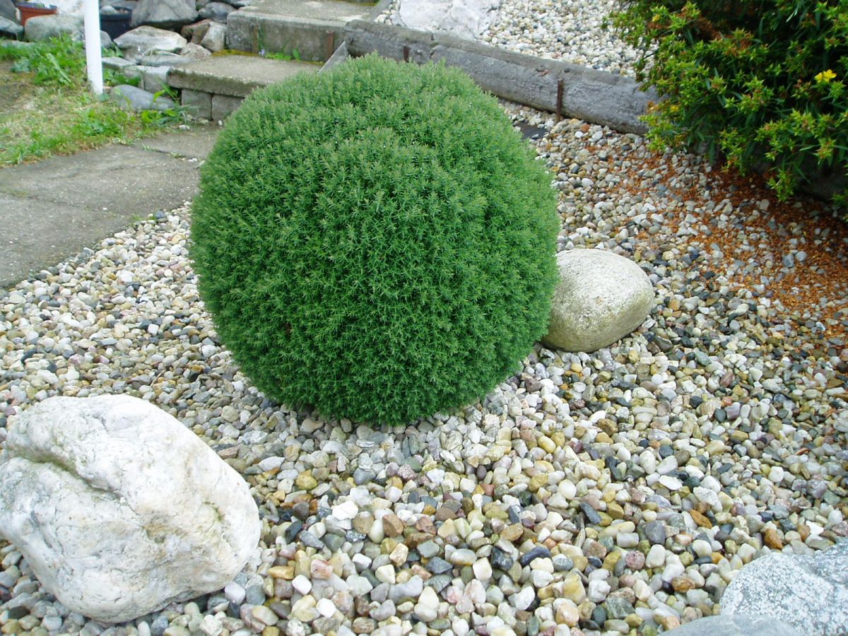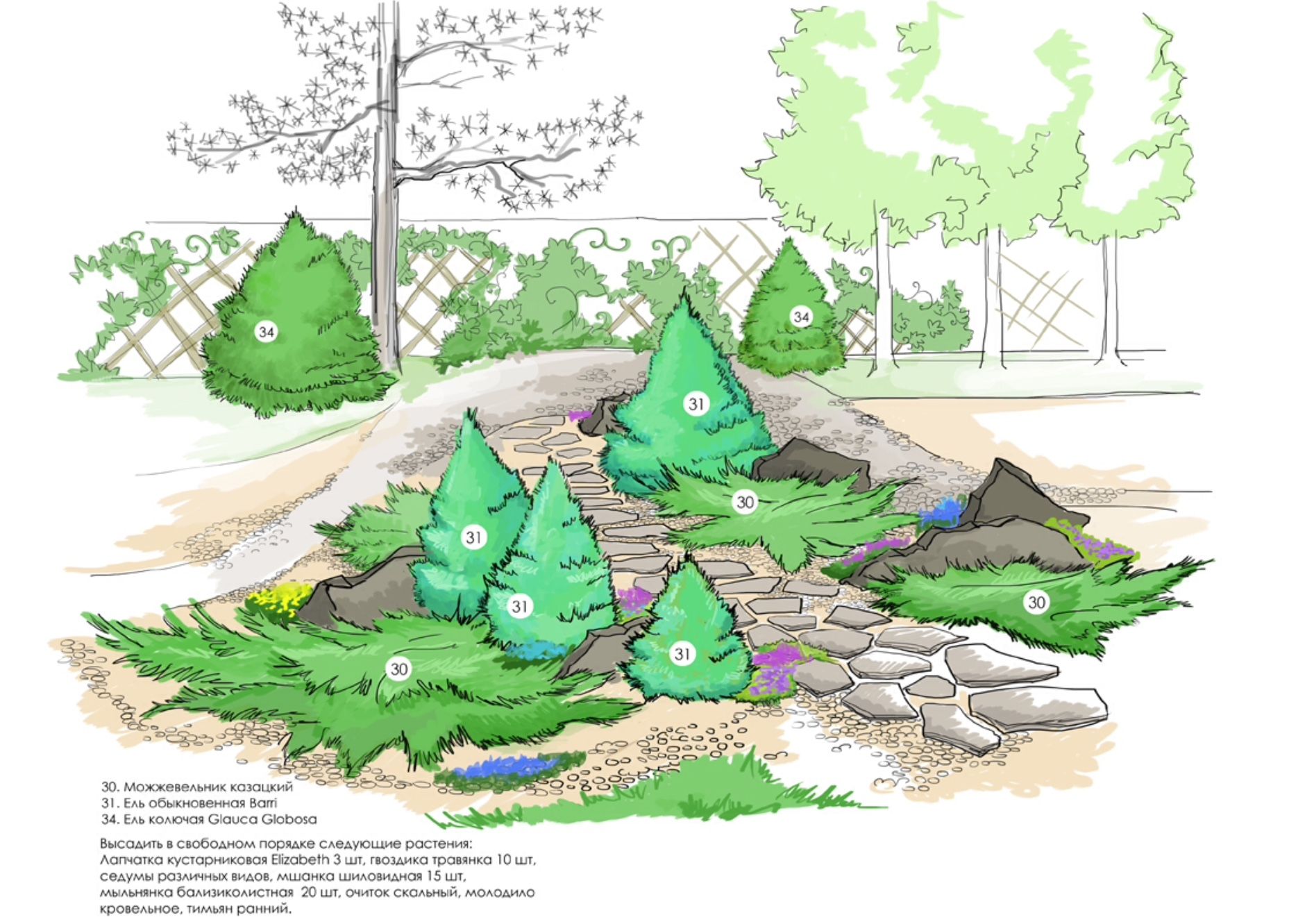 Применяйте шаровидные туи, невысокие кусты можжевельника, маленькие елочки и сосенки. Сажать такую растительность предпочтительно в марте или осенью.