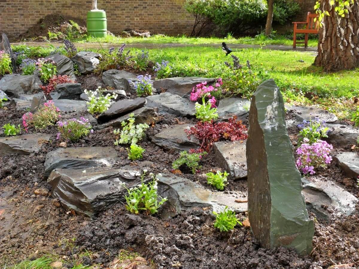 - Между камнями насыпается плодородная почва. Растения высаживаются как между камнями, так и вокруг них.