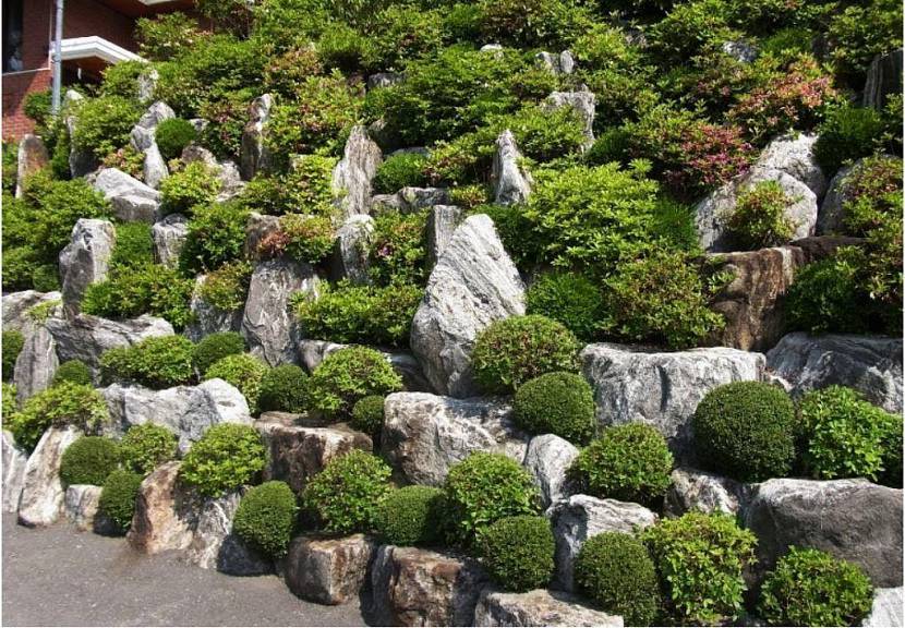 - Японский стиль рокария. Отдельно расположенные крупные камни. Между крупными камнями мелкий камень (щебень) и невысокие растения. Рокарий в японском стиле часто делают прямоугольным, с 1 или 2 прямыми сторонами. Камни разные по форме и размеру, но одинаковые по цвету. Камни закапывают в землю примерно на 1/3. Растения не высокие: трава, мелкий кустарник. Без ярких цветов. Поверхность рокария в японском стиле плоская, без резких перепадов высот. Основную площадь занимают камни и щебень, растения уходят на второй план.